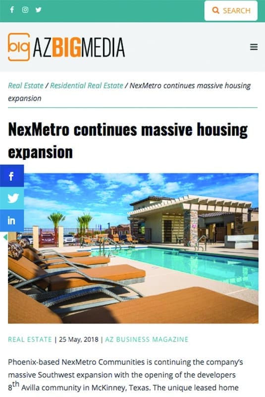 The Goodyear asset represented the company's official entry into the Phoenix market in 2014 after a group of innovative entrepreneurs developed the Avilla Homes prototype with seven rental neighborhoods in Tucson, Arizona starting in 2011. NexMetro was recently ranked #119 on Professional Builder's 2018 Housing Giants List (a 47% jump from the year prior) because of its unique detached single family rental production.
